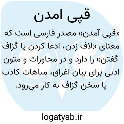 «قپی آمدن» یک عبارت فارسی عامیانه و مرکب است که در متون لغوی و فرهنگ‌های فارسی ثبت شده است و بیشتر در زبان محاوره و ضرب‌المثل‌ها کاربرد دارد. معنای اصلی این عبارت «لاف زدن» یا «گزاف گفتن» است، یعنی کسی که سخنان خود را بزرگ‌نمایی می‌کند یا بدون مبنا ادعا می‌نماید. همچنین «قپی آمدن» به معنای ادعا کردن یا اظهار توانایی و شایستگی به صورت اغراق‌آمیز نیز ذکر شده است. این عبارت معمولاً برای انتقاد یا طنز نسبت به فردی به کار می‌رود که توانایی واقعی ندارد اما مدعی یا مباهات‌کننده است. در ادبیات محلی و داستان‌های عامیانه، این عبارت برای نشان دادن غرور کاذب، فخر فروشی و سخنان بی‌پایه افراد استفاده می‌شود. بنابراین، «قپی آمدن» مصدر فارسی است که معنای «لاف زدن، ادعا کردن یا گزاف گفتن» را دارد و در محاورات و متون ادبی برای بیان اغراق، مباهات کاذب یا سخن گزاف به کار می‌رود.