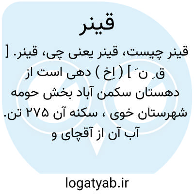 قینر. [ ق ِ ن َ ] ( اِخ ) دهی است از دهستان سکمن آباد بخش حومه شهرستان خوی، سکنه آن 275 تن. آب آن از آقچای و چشمه و محصول آن غلات و حبوب. شغل اهالی زراعت، گله داری و صنایع دستی زنان آنجا جاجیم بافی است. راه ارابه رو دارد و اتومبیل از آن می توان برد. این ده در دو محل بفاصله 2500 گز به نام قینر بالا و پائین مشهور است. سکنه قینر پایین 145 تن میباشد. ( از فرهنگ جغرافیایی ایران ج 4 ).