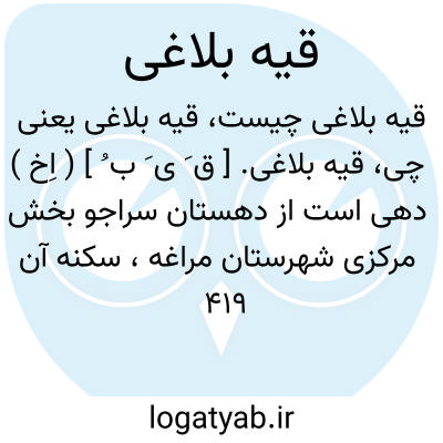 قیه بلاغی. [ ق َ ی َ ب ُ ] ( اِخ ) دهی است از دهستان سراجو بخش مرکزی شهرستان مراغه، سکنه آن 419 تن. آب آن از چشمه سارها. محصول آن غلات، توتون، کرچک، نخود و زردآلو. شغل اهالی زراعت و صنایع دستی زنان آنجا کرباس و جاجیم بافی است.راه مالرو دارد. ( از فرهنگ جغرافیایی ایران ج 4 ).