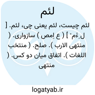 لئم. [ ل ِءْم ْ ] ( ع اِمص ) سازواری. ( منتهی الارب ). صلح. ( منتخب اللغات ). اتفاق میان دو کس. ( منتهی الارب ). ( منتخب اللغات ). آشتی. ( منتهی الارب ). || ( اِ ) انگبین. ( منتهی الارب ). از اسماء عسل. ( المزهر سیوطی ص 342 ).