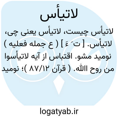 لاتیأس. [ ت َ ءَ ] ( ع جمله فعلیه ) نومید مشو. اقتباس از آیه لاتیأسوا من روح اﷲ. ( قرآن 87/12 )؛ نومید از رحمت خدا مشوید: