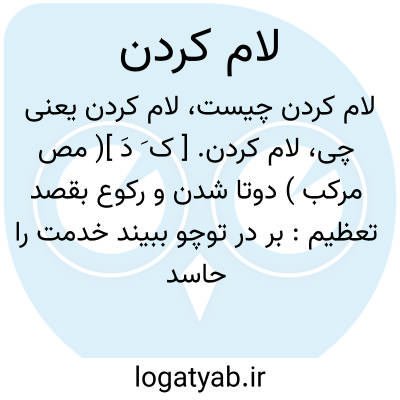 لغت نامه دهخدا لام کردن. [ ک َ دَ ]( مص مرکب ) دوتا شدن و رکوع بقصد تعظیم: بر در توچو ببیند خدمت را حاسدلامها کرده، ز غم با قد چون نون گذرد.رضی الدین نیشابوری.رجوع به لام شود.