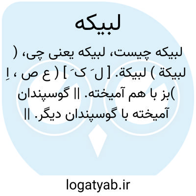 لغت نامه دهخدا ( لبیکة ) لبیکة. [ ل َ ک َ ] ( ع ص، اِ )بز با هم آمیخته. || گوسپندان آمیخته با گوسپندان دیگر. || گروه مردم و جز آن. || پنیر با پِسْت آمیخته. || خرما با روغن آمیخته. ( منتهی الارب ). || آن طعام که از مسکه و روغن و دوشاب سازند. ( مهذب الاسماء ).