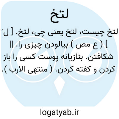 لغت نامه دهخدا لتخ. [ ل َ ] ( ع مص ) بیالودن چیزی را. || شکافتن. بتازیانه پوست کسی را باز کردن و کفته کردن. ( منتهی الارب ).