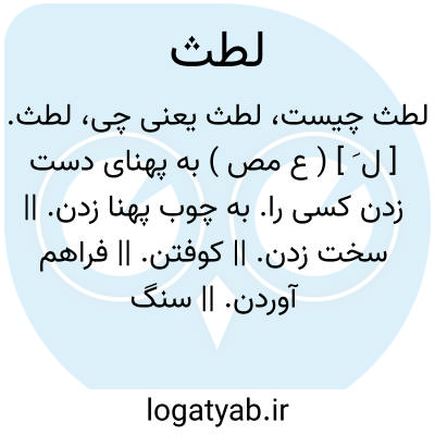 لطث. [ ل َ ] ( ع مص ) به پهنای دست زدن کسی را. به چوب پهنا زدن. || سخت زدن. || کوفتن. || فراهم آوردن. || سنگ انداختن به سوی کسی. || دشوار شدن کار بر کسی. || گران شدن بار بر کسی. || ( اِمص ) تباهی. ( منتهی الارب ).