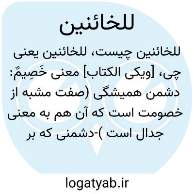 [ویکی الکتاب] معنی خَصِیمٌ: دشمن همیشگی (صفت مشبه از خصومت است که آن هم به معنی جدال است )-دشمنی که بر خصومت و جدال اصرار میورزد - کسی که از دعوی مدعی و یا هر چیزی که در حکم دعوی است دفاع میکند (درجمله "لَا تَکُن لِّلْخَائِنِینَ خَصِیماً "رسول خدا (صلیاللهعلیهوآلهوسلّم) را نه...