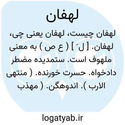 لهفان. [ ل َ ] ( ع ص ) به معنی ملهوف است. ستمدیده مضطر دادخواه. حسرت خورنده. ( منتهی الارب ). اندوهگن. ( مهذب الاسماء ). اندوهناک. ( دهار ).