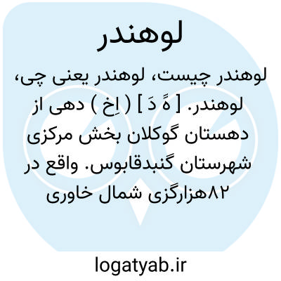 لوهندر. [ هََ دَ ] ( اِخ ) دهی از دهستان گوکلان بخش مرکزی شهرستان گنبدقابوس. واقع در 82هزارگزی شمال خاوری گنبدقابوس و 16هزارگزی پل چشمه. کوهستانی و سردسیر. دارای 355 تن سکنه. آب آن از چشمه. محصول آنجا غلات، حبوبات، ابریشم و لبنیات. شغل اهالی زراعت و گله داری و صنایع دستی زنان بافتن پارچه های ابریشمی و راه آن مالرو است و در کوههای آن شکار بسیار باشد. ( از فرهنگ جغرافیائی ایران ج 3 ).