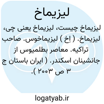 لغت نامه دهخدا لیزیماخ. ( اِخ ) لیزیماخوس. صاحب تراکیه. معاصر بطلمیوس از جانشینان اسکندر. ( ایران باستان ج 3 ص 2003 ).