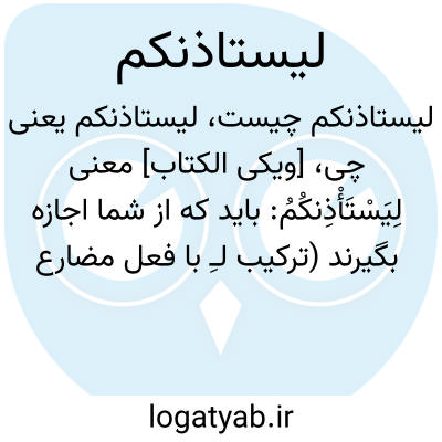 دانشنامه اسلامی [ویکی الکتاب] معنی لِیَسْتَأْذِنکُمُ: باید که از شما اجازه بگیرند (ترکیب لـِ با فعل مضارع فعل امر می سازد. حرف میم آن هم به دلیل تقارنش با حرف ساکن یا تشدید دار کلمه بعد حرکت گرفته است)ریشه کلمه: اذن (۱۰۲ بار)کم (۲۲۹۱ بار)ل (۳۸۴۲ بار)