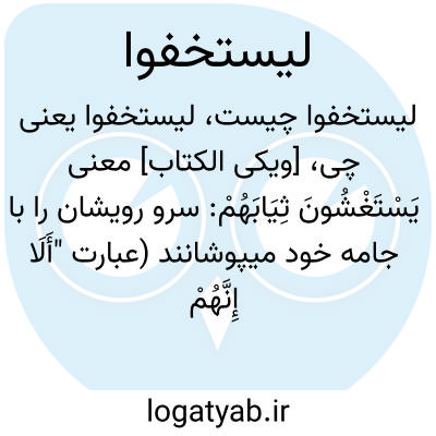 [ویکی الکتاب] معنی یَسْتَغْشُونَ ثِیَابَهُمْ: سرو رویشان را با جامه خود میپوشانند (عبارت "أَلَا إِنَّهُمْ یَثْنُونَ صُدُورَهُمْ لِیَسْتَخْفُواْ مِنْهُ أَلَا حِینَ یَسْتَغْشُونَ ثِیَابَهُمْ یَعْلَمُ مَا یُسِرُّونَ وَمَا یُعْلِنُونَ " یعنی: آگاه باشید که مشرکان سر در گریبان فرو میبرند تا [خود را...
