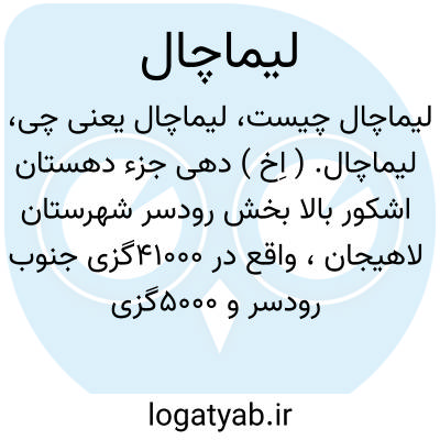 لیماچال. ( اِخ ) دهی جزء دهستان اشکور بالا بخش رودسر شهرستان لاهیجان، واقع در 41000گزی جنوب رودسر و 5000گزی جنوب خاوری سی پل. کوهستانی، معتدل و سردسیر. دارای 379 تن سکنه. آب آن از چشمه سار. محصول آنجا غلات، بنشن، لبنیات و عسل. شغل اهالی زراعت، گله داری، نجاری و آهنگری و صنایع دستی آنان شال بافی و راه آن مالروو صعب العبور است. اغلب اهالی در فصل زمستان برای کسب به گیلان میروند. ( از فرهنگ جغرافیائی ایران ج 2 ).