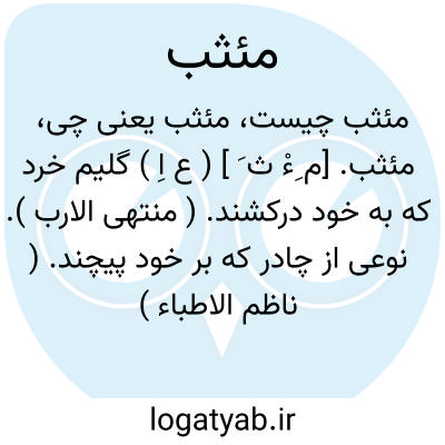 مئثب. [م ِءْ ث َ ] ( ع اِ ) گلیم خرد که به خود درکشند. ( منتهی الارب ). نوعی از چادر که بر خود پیچند. ( ناظم الاطباء ) ( از ذیل اقرب الموارد ). || زمین نرم و هموار. ( منتهی الارب ) ( از اقرب الموارد ). زمین نرم. ( ناظم الاطباء ). || زمین بلند. ( منتهی الارب ). زمین برآمده و مرتفع. ( ناظم الاطباء ) ( از اقرب الموارد ). || جویچه. ج، مآثب. ( منتهی الارب ) ( ناظم الاطباء ). جدول یعنی نهر کوچک. ( از اقرب الموارد ). || شمشیر کوتاه یا سلاحی دیگر که بدان برکسی حمله کنند. ( ناظم الاطباء ) ( از فرهنگ جانسون ).