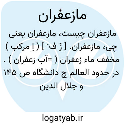 مازعفران. [ زَ ف َ ] ( اِ مرکب ) مخفف ماء زعفران ( =آب زعفران ). در حدود العالم چ دانشگاه ص 145 و جلال الدین تهرانی ص 85 در ذیل ساری آرد:... از وی جامه حریر و پرنیان و خاو خیزد و از وی «مازعفران » و «ماصندل » و «ماخلوق » خیزد که بهمه جهان از آنجا برند.