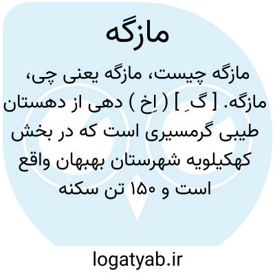 مازگه. [ گ ِ ] ( اِخ ) دهی از دهستان طیبی گرمسیری است که در بخش کهکیلویه شهرستان بهبهان واقع است و 150 تن سکنه دارد که از طایفه طیبی هستند. ( از فرهنگ جغرافیایی ایران ج 6 ).