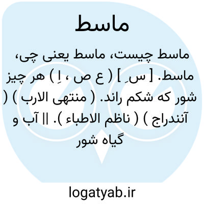 ماسط. [ س ِ ] ( ع ص، اِ ) هر چیز شور که شکم راند. ( منتهی الارب ) ( آنندراج ) ( ناظم الاطباء ). || آب و گیاه شور شکم ران. ( منتهی الارب ) ( آنندراج ). آب شور و گیاه شور که شکم راند. ( ناظم الاطباء ). آب شور که شکم راند. ( از اقرب الموارد ). || گیاهی است تابستانی که شکم شتر راند. ( منتهی الارب ) ( آنندراج ) ( ناظم الاطباء ) ( از اقرب الموارد ).