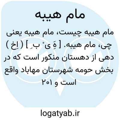 مام هیبه. [ هَِ ی ْ ب ِ ] ( اِخ ) دهی از دهستان منکور است که در بخش حومه شهرستان مهاباد واقع است و 201 تن سکنه دارد. ( از فرهنگ جغرافیایی ایران ج 4 ).