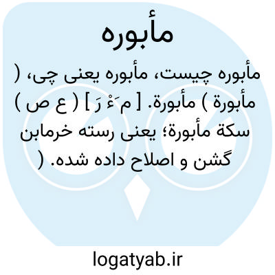 ( مأبورة ) مأبورة. [ م َءْ رَ ] ( ع ص ) سکة مأبورة؛ یعنی رسته خرمابن گشن و اصلاح داده شده. ( منتهی الارب ). نخلة مأبورة؛ خرمابن گشن داده شده و سکة مأبوره؛ راسته خرما بنان گشن داده شده. ( ناظم الاطباء ). || شاة مأبورة؛ یعنی گوسپند سوزن خورانیده. ( منتهی الارب ) ( ناظم الاطباء ). || کسی که کژدم او را نیش زده باشد. ( منتهی الارب ) ( آنندراج ) ( از ناظم الاطباء ) ( از اقرب الموارد ). || متهم و مطعون. ( یادداشت به خط مرحوم دهخدا ): لست بمأبور فی دینی، قول امیرالمؤمنین علی بن ابیطالب علیه السلام است بطریق استعاره یعنی نیستم تهمت وطعن کرده شده به دین و اسلام خود. و در این قول مأثور هم آمده. ( از منتهی الارب ) ( از آنندراج ) ( از ناظم الاطباء ) ( از اقرب الموارد ). و رجوع به مأثور شود.