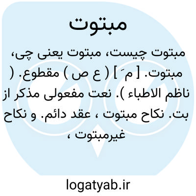 مبتوت. [ م َ ] ( ع ص ) مقطوع. ( ناظم الاطباء ). نعت مفعولی مذکر از بت. نکاح مبتوت، عقد دائم. و نکاح غیرمبتوت، متعه. عقد انقطاع. ( یادداشت به خط مرحوم دهخدا ).
