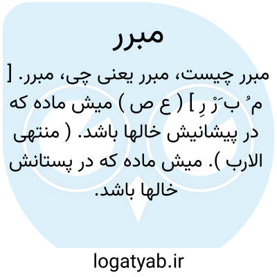 مبرر. [ م ُ ب َرْ رِ ] ( ع ص ) میش ماده که در پیشانیش خالها باشد. ( منتهی الارب ). میش ماده که در پستانش خالها باشد. ( آنندراج ) ( از ذیل اقرب الموارد ) ( از تاج العروس ). میش ماده که در پستانش خالها باشد و آثار آبستنی آشکار گردد. || حق دهنده. ( ناظم الاطباء ).