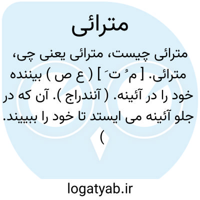 مترائی. [ م ُ ت َ ] ( ع ص ) بیننده خود را در آئینه. ( آنندراج ). آن که در جلو آئینه می ایستد تا خود را ببییند. ( ناظم الاطباء ) ( از منتهی الارب ) ( از اقرب الموارد ). || دوچار شونده. ( آنندراج ) ( از منتهی الارب ) ( از اقرب الموارد ). || اندیشه کننده در کاری. ( از منتهی الارب ) ( از اقرب الموارد ). || غوره خرمای سرخ و زرد شده. ( ناظم الاطباء ) ( از منتهی الارب ) ( از اقرب الموارد ).