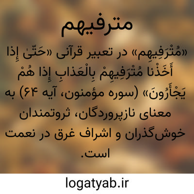 واژه «مُتْرَفِیهِم» در تعبیر قرآنی «حَتّىٰ إِذا أَخَذْنا مُتْرَفِیهِمْ بِالْعَذابِ إِذا هُمْ يَجْأَرُونَ» (سوره مؤمنون، آیه ۶۴) به معنای نازپروردگان، ثروتمندان خوش‌گذران و اشراف غرق در نعمت است؛ کسانی که فراوانی امکانات مادی و رفاه دنیوی، آنان را به غرور، غفلت و سرکشی کشانده است. این واژه از ریشه «ترف» گرفته شده که در زبان عربی به معنای فراخی در نعمت، رفاه و برخورداری بسیار است، اما در کاربرد قرآنی غالباً بار معنایی منفی دارد و به افرادی اشاره می‌کند که نعمت فراوان، آنان را به طغیان، خودبرتربینی و بی‌اعتنایی به حق سوق داده است. در آیه شریفه، خداوند می‌فرماید: «حَتّىٰ إِذا أَخَذْنا مُتْرَفِیهِمْ بِالْعَذابِ إِذا هُمْ يَجْأَرُونَ»؛ یعنی «تا آن‌گاه که نازپروردگان و ثروتمندان آنان را به عذاب گرفتار کردیم، ناگهان به فریاد و ناله افتادند». این تعبیر نشان می‌دهد که مترفین معمولاً همان طبقه‌ای هستند که در اوج رفاه، دعوت پیامبران را انکار می‌کنند و به سبب دلبستگی شدید به دنیا، در برابر حقیقت مقاومت می‌ورزند. در تفاسیر علمی و ادبی قرآن، «مترفین» غالباً به سران جامعه، اشراف مرفه و صاحبان قدرت و ثروت اطلاق می‌شود که به دلیل احساس بی‌نیازی، بیش از دیگران در معرض کفر، استکبار و فساد قرار می‌گیرند. بنابراین، معنای دقیق این واژه تنها «ثروتمند» نیست، بلکه ثروتمند مغرور و غرق در نعمت که رفاه او را از مسیر حق دور ساخته است را می‌رساند. این مفهوم در سیاق آیه، هشداری جدی درباره پیامدهای غفلت ناشی از رفاه‌زدگی و دنیاپرستی است.