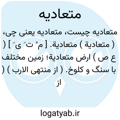 ( متعادیة ) متعادیة. [ م ُ ت َ ی َ ] ( ع ص ) ارض متعادیة؛ زمین مختلف با سنگ و کلوخ. ( از منتهی الارب ) ( از اقرب الموارد ) ( آنندراج ). زمین مختلف سنگناک دارای دره و زمین باسنگ و کلوخ. ( ناظم الاطباء ). و رجوع به تعادی شود.