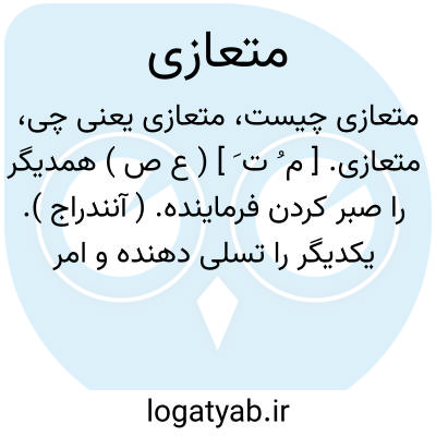 متعازی. [ م ُ ت َ ] ( ع ص ) همدیگر را صبر کردن فرماینده. ( آنندراج ). یکدیگر را تسلی دهنده و امر به صبر و شکیبائی نماینده. ( ناظم الاطباء ) ( از منتهی الارب ) ( از اقرب الموارد ). و رجوع به تعازی شود.