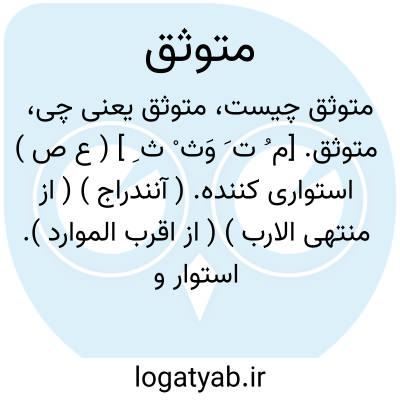 لغت نامه دهخدا متوثق. [م ُ ت َ وَث ْ ث ِ ] ( ع ص ) استواری کننده. ( آنندراج ) ( از منتهی الارب ) ( از اقرب الموارد ). استوار و پایدار وثابت در کار. ( ناظم الاطباء ). و رجوع به توثق شود.