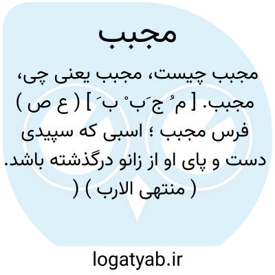 مجبب. [ م ُ ج َب ْ ب َ ] ( ع ص ) فرس مجبب؛ اسبی که سپیدی دست و پای او از زانو درگذشته باشد. ( منتهی الارب ) ( آنندراج ) ( ناظم الاطباء ) ( از اقرب الموارد ). مجبب. [ م ُ ج َب ْ ب ِ ] ( ع ص ) رمنده و گریزنده. ( آنندراج ) ( از منتهی الارب ) ( از ذیل اقرب الموارد ). || گریخته از جنگ. ( ناظم الاطباء ).