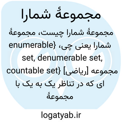 {enumerable set, denumerable set, countable set} [ریاضی] مجموعه ای که در تناظر یک به یک با مجموعۀ اعداد طبیعی باشد