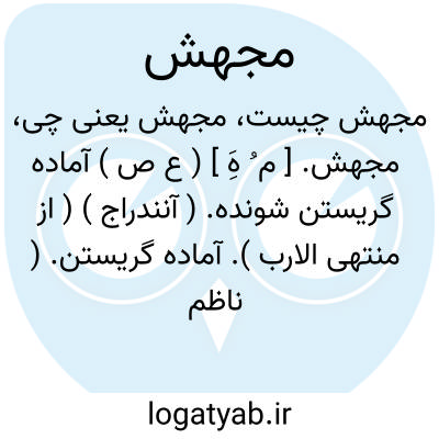 مجهش. [ م ُ هَِ ] ( ع ص ) آماده گریستن شونده. ( آنندراج ) ( از منتهی الارب ). آماده گریستن. ( ناظم الاطباء ) ( از اقرب الموارد ). || شتاباننده. ( آنندراج ). کسی که می شتاباند. ( ناظم الاطباء ) ( از منتهی الارب ). || برجهنده و برخیزنده. || ترسنده و هراسنده. ( ناظم الاطباء ) ( از فرهنگ جانسون ).