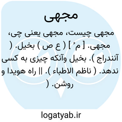 مجهی. [ م ُ ] ( ع ص ) بخیل. ( آنندراج ). بخیل وآنکه چیزی به کسی ندهد. ( ناظم الاطباء ). || راه هویدا و روشن. ( آنندراج ) ( ناظم الاطباء ). || زن باردار ناشونده. ( آنندراج ) ( از منتهی الارب ). || هوای گشاده شوند. ( آنندراج ). آسمان گشاده و بی ابر و صاف. ( ناظم الاطباء ). || خباء مُجْه؛ خیمه بی پرده. ( منتهی الارب ) ( ناظم الاطباء ) ( از اقرب الموارد ).