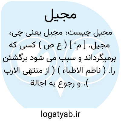 مجیل. [ م ُ ] ( ع ص ) کسی که برمیگرداند و سبب می شود برگشتن را. ( ناظم الاطباء ) ( از منتهی الارب ). و رجوع به اجالة شود. || آن که گرد می سازد و گرد می کند. ( ناظم الاطباء ) ( از فرهنگ جانسون ).