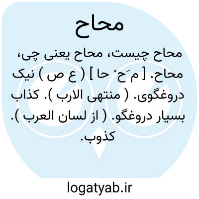 محاح. [ م َح ْ حا ] ( ع ص ) نیک دروغگوی. ( منتهی الارب ). کذاب بسیار دروغگو. ( از لسان العرب ). کذوب. || آن که به سخن دل خوش کند کسی را و بس. ( منتهی الارب ). سخن فروش. ( مهذب الاسماء ). کسی که مردم را با سخن خود نه با کردار راضی کند. ( از لسان العرب ).
