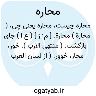 ( محارة ) محارة. [ م َ رَ ] ( ع اِ ) جای بازگشت. ( منتهی الارب ). حَور، محار، حُوور. ( از لسان العرب ). || اندرون گوش. ج، محارات. || پیوند کتف. || صدف. || هر استخوانی که مانند صدف باشد. ( منتهی الارب ) ( ناظم الاطباء ). || چیزی است مانند هودج. ( منتهی الارب ). قسمی از هودج. ( ناظم الاطباء ). || مابین عذود ( ؟ ) تا پیش سم. ( منتهی الارب ). آن جزئی که واقع شده است ما بین نسر یعنی برآمدگی سم و پیش سم. ( ناظم الاطباء ).منسم البعیر. ( اقرب الموارد ). || خط. ( منتهی الارب ). || رسم. ( ناظم الاطباء ). || کرانه. ( منتهی الارب ) ( ناظم الاطباء ). || ناحیه. ( ناظم الاطباء ). || زنخدان. حنک. || زیر حنک و زنخدان. || منفذ و راه تنفس به خیشوم. || تیزی و رگ ران. || بالای درونی دهان اسب، محارةالفرس. ( از تاج العروس ). کام ستور. ( ناظم الاطباء ) ( منتهی الارب ). || نقصان، یقال حور فی محارة ( بالضم و الفتح )؛ یعنی نقصان در نقصان است و این مثل برای کسی زنند که در ادبار و بدبختی است یا در گمراهی است و صلاح نپذیرد و حال آنکه درستکار وصالح بوده است. ( از منتهی الارب ) ( از تاج العروس ).