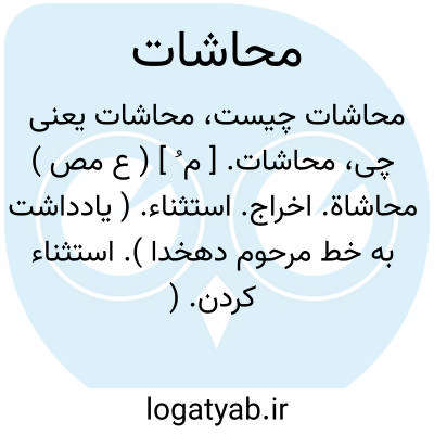 محاشات. [ م ُ ] ( ع مص ) محاشاة. اخراج. استثناء. ( یادداشت به خط مرحوم دهخدا ). استثناء کردن. ( از ناظم الاطباء ). || باک داشتن. ( یادداشت به خط مرحوم دهخدا ). رجوع به محاشاة شود. محاشاة. [ م ُ ] ( ع مص ) استثناء کردن. ( تاج المصادر زوزنی ). استثناء کردن کسی را از جماعتی. ( آنندراج ) ( از ناظم الاطباء ).