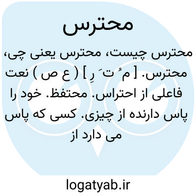 محترس. [ م ُ ت َ رِ ] ( ع ص ) نعت فاعلی از احتراس. محتفظ. خود را پاس دارنده از چیزی. کسی که پاس می دارد از مخالفت و حراست می کند. ( آنندراج ) ( ناظم الاطباء ): به حصانت آن حصن از صدمه اولی و طامه کبری محترس شد. ( ترجمه تاریخ یمینی ص 195 ). || آنکه شبانه دزدی می کند. ( ناظم الاطباء ). || محترس من مثله و هو حارس؛ مثلی است و معنی آنکه خبیثی را عیب کند و خود خبیث تر از اوست. ( یادداشت مرحوم دهخدا ).