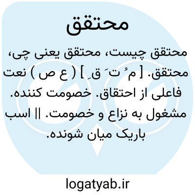 محتقق. [ م ُ ت َ ق ِ ] ( ع ص ) نعت فاعلی از احتقاق. خصومت کننده. مشغول به نزاع و خصومت. || اسب باریک میان شونده. ( از منتهی الارب ) ( ناظم الاطباء ).