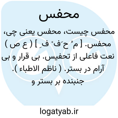 محفس. [ م ُ ح َف ْ ف ِ ] ( ع ص ) نعت فاعلی از تحفیس. بی قرار و بی آرام در بستر. ( ناظم الاطباء ). جنبنده بر بستر و بی قرار. ( آنندراج ). || علیحده و جداشده. ( ناظم الاطباء ). || زنی که آرایش میکند ساقهای خود را با خلخال. ( ناظم الاطباء ).