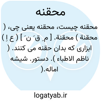 ( محقنة ) محقنة. [ م ِ ق َ ن َ ] ( ع اِ ) ابزاری که بدان حقنه می کنند. ( ناظم الاطباء ). دستور. شیشه اماله.( یادداشت مرحوم دهخدا ). ایریگاتور: اگر قرحه کهن بود، نخست رحم بباید شست به ماءالعسل به محقنه و زراقه. ( ذخیره خوارزمشاهی ).