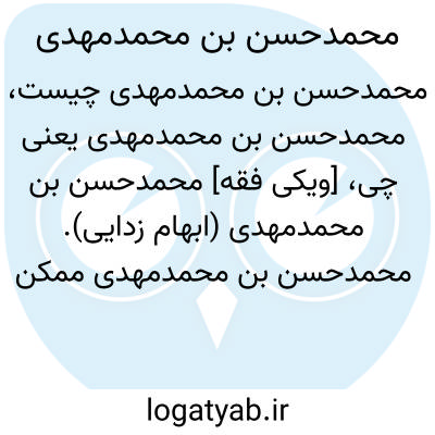 [ویکی فقه] محمدحسن بن محمدمهدی (ابهام زدایی). محمدحسن بن محمدمهدی ممکن است اشاره به اشخاص و شخصیت های ذیل باشد: • محمدحسن بن محمدمهدی قاری اصفهانی، از فضلاء و خطاطان اصفهان در قرن سیزدهم هجری• سیدمحمدحسن بن سیدمهدی نحوی اصفهانی، عالم فاضل فقیه، از دانشمندان قرن چهاردهم هجری در اصفهان• سیدمحمدحسن بن محمدمهدی خدائی درب امامی اصفهانی، شاعر ادیب قرن چهاردهم هجری در اصفهان