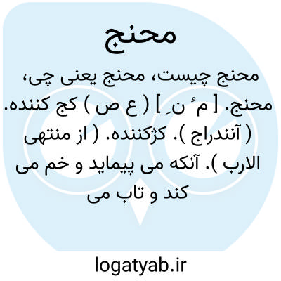 محنج. [ م ُ ن ِ ] ( ع ص ) کج کننده. ( آنندراج ). کژکننده. ( از منتهی الارب ). آنکه می پیماید و خم می کند و تاب می دهد. || حیله باز. || آنکه سوگند دروغ می خورد. ( ناظم الاطباء ).