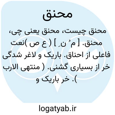 محنق. [ م ُ ن ِ ] ( ع ص )نعت فاعلی از احناق. باریک و لاغر شدگی خر از بسیاری گشنی. ( منتهی الارب ). خر باریک و لاغر از بسیاری گشنی.( آنندراج ). خر لاغر و نزار شده از بس گشنی. || بعیر محنق؛ شتر لاغر و یا فربه. ج، محانیق؛ یقال ابل محانیق. ( ناظم الاطباء ). اشتر اندک گوشت لاغر. ( مهذب الاسماء ). || خشم آورنده. ( ناظم الاطباء ).