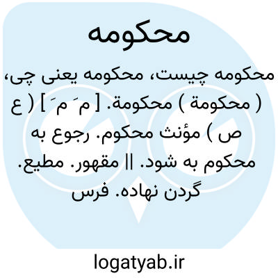( محکومة ) محکومة. [ م َ م َ ] ( ع ص ) مؤنث محکوم. رجوع به محکوم به شود. || مقهور. مطیع. گردن نهاده. فرس محکومة؛ اسب لگام کرده شده. ( از منتهی الارب ). اسب لگام کرده شده و دهنه زده شده. ( ناظم الاطباء ).