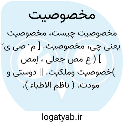 مخصوصیت. [ م َ صی ی َ ] ( ع مص جعلی، اِمص )خصوصیت وملکیت. || دوستی و مودت. ( ناظم الاطباء ).