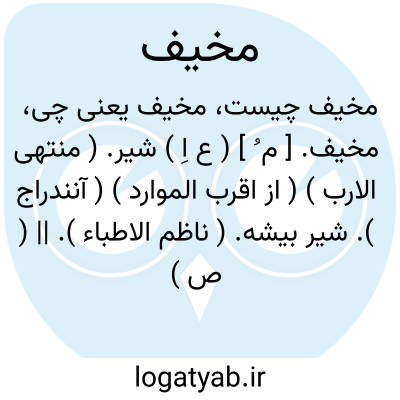 مخیف. [ م ُ ] ( ع اِ ) شیر. ( منتهی الارب ) ( از اقرب الموارد ) ( آنندراج ). شیر بیشه. ( ناظم الاطباء ). || ( ص ) ترساننده و هولناک. وجع مخیف؛ درد ترساننده. ( ناظم الاطباء ) ( از منتهی الارب ) ( ازاقرب الموارد ) ( از آنندراج ). و رجوع به اخافة شود.