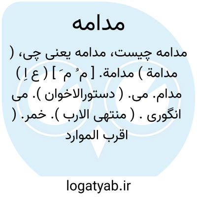 ( مدامة ) مدامة. [ م ُ م َ ] ( ع اِ ) مدام. می. ( دستورالاخوان ). می انگوری. ( منتهی الارب ). خمر. ( اقرب الموارد ). رجوع به مدام شود.