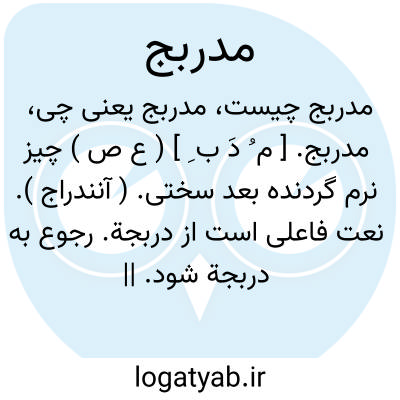 مدربج. [ م ُ دَ ب ِ ] ( ع ص ) چیز نرم گردنده بعد سختی. ( آنندراج ). نعت فاعلی است از دربجة. رجوع به دربجة شود. || مهربان. ( ناظم الاطباء ).شتر ماده مهربان بر بچه خود. ( آنندراج ): دربجت الناقة؛ رئمت ولدها. ( متن اللغة ). رجوع به دربجة شود.