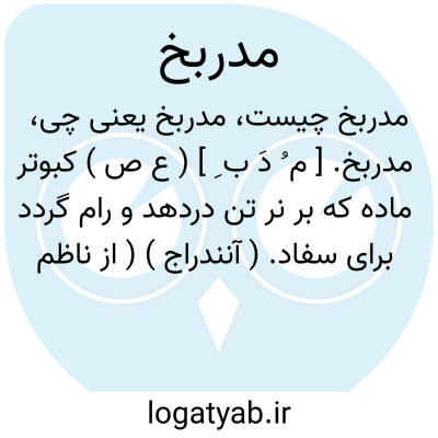 مدربخ. [ م ُ دَ ب ِ ] ( ع ص ) کبوتر ماده که بر نر تن دردهد و رام گردد برای سفاد. ( آنندراج ) ( از ناظم الاطباء ) ( از متن اللغة ). نعت فاعلی است ازدربخة. رجوع به دربخة شود. || مرد پشت خم کرده و فروتن. ( ناظم الاطباء ): دربخ الرجل؛ طأطاء رأسه و بسط ظهره. ( از متن اللغة ). رجوع به دربخة شود.